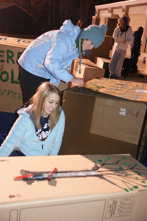 Co-presidents Maggie Barnard and Kaitlyn Rabach, came up with the idea of Cardboard Village. The event consisted of students spending the night on the football field in cardboard boxes...in 30 degree weather. In order to participate in the event, students were expected to raise a minimum of 50 dollars. The majority of the students surpassed that goal. The event brought in almost 5,000 dollars, all of which is going to the construction of the school.